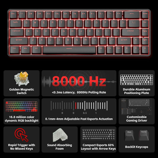 DK68-C 60% Gaming HE Keyboard, Magnetic Switch Hot Swappable, Rapid Trigger, Adjustable Actuation, 8000Hz Polling Rate, RGB Backlit, Compact 68 Keys for Windows PC, Wired, Black